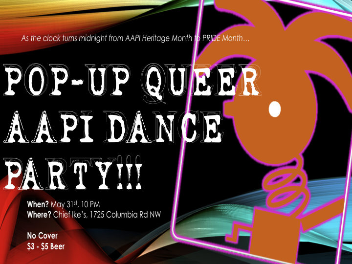 - Friday, May 31 at 10pm (Tomorrow night!): Pop-up AAPI Queer Dance Party